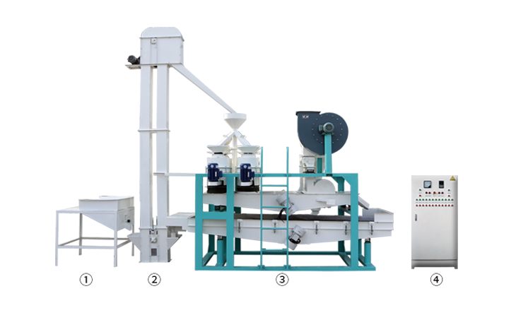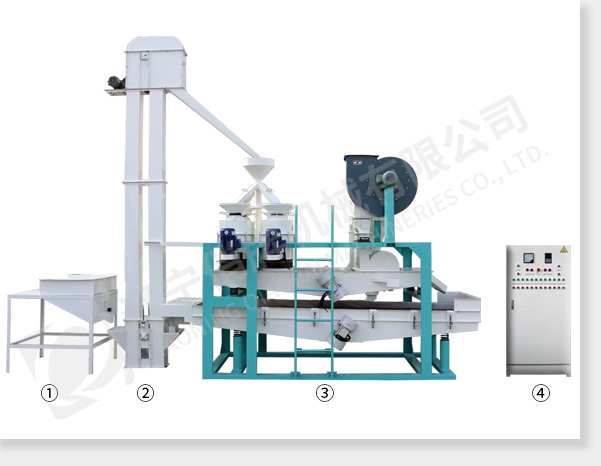 ① 上料斗② 斗式提升機(jī) ③ 脫殼、風(fēng)選、分選主機(jī) ④ 電氣控制柜
